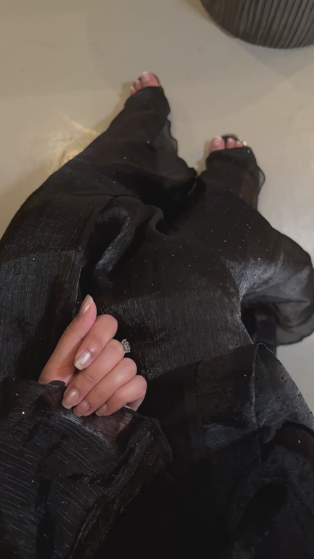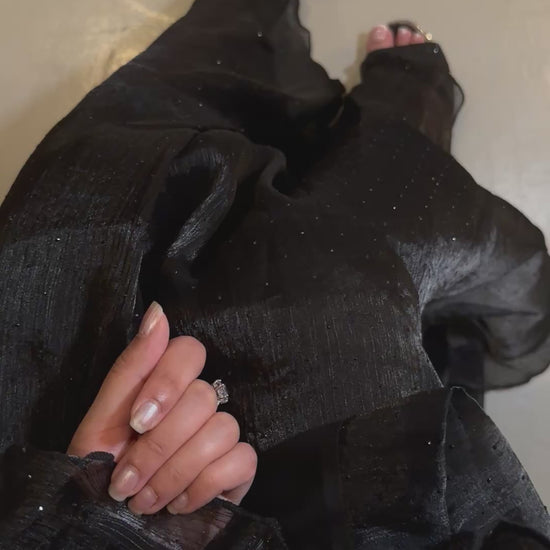 Step out in style with the SAMARA organza abaya set. Glistening rhinestones adorn this 4-piece set that includes an abaya, matching inner dress, belt, and chiffon sheila/hijab. The perfect choice for a glamorous evening out.